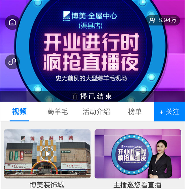 為本次開業(yè)活動預熱,早在2020年4月20日,博美﹒全屋中心(渠縣店)進行了首場開業(yè)直播,直播現(xiàn)場設置多項活動環(huán)節(jié),分享有禮、集贊有禮、薅羊毛活動等,極大的提高了疫情期間的消費流量。據(jù)不完全統(tǒng)計,本次“開業(yè)進行時、瘋搶直播夜”直播活動輻射人群將近9萬人,為博美裝飾城在更具消費潛力的三四線市場打開了影響力。