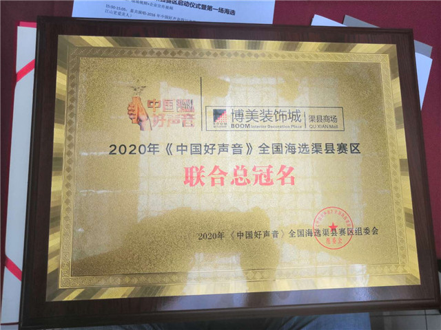 2020《中國好聲音》全國海選渠縣賽區(qū)組委會為博美﹒全屋中心授牌《戰(zhàn)略合作單位》。