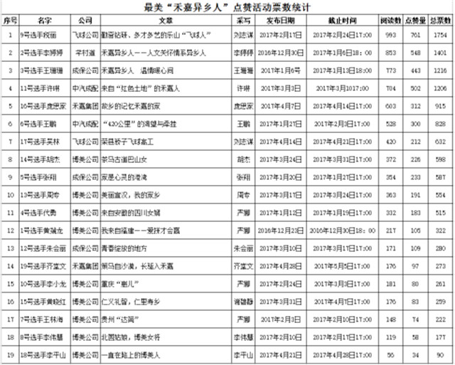 活動(dòng)設(shè)置四個(gè)獎(jiǎng)項(xiàng),分別是最佳可愛獎(jiǎng)、最佳人氣獎(jiǎng)、最佳認(rèn)同獎(jiǎng)、最佳融入獎(jiǎng)。根據(jù)微信每篇“禾嘉異鄉(xiāng)人”閱讀數(shù)和點(diǎn)贊數(shù)的總票數(shù)決出名次并評(píng)選出獲獎(jiǎng)結(jié)果如下:最佳可愛獎(jiǎng)二名,為:9號(hào)選手稅麗、2號(hào)選手李婷婷,獎(jiǎng)金各600元;最佳人氣獎(jiǎng)三名,為:3號(hào)選手王珊珊、11號(hào)選手許琳、16號(hào)選手龐思家,獎(jiǎng)金各400元;最佳認(rèn)同獎(jiǎng)六名,為:6號(hào)選手王鵬、17號(hào)選手吳林、14號(hào)選手胡杰、5號(hào)選手張翔、13號(hào)選手周專、4號(hào)選手代勇,獎(jiǎng)金各300元;最佳融入獎(jiǎng)八名,為:1號(hào)選手黃端龍、12號(hào)選手朱會(huì)麗、19號(hào)選手齊堂文、10號(hào)選手李小龍、15號(hào)選手黃曉紅、7號(hào)選手王林海、8號(hào)選手李偉慧、18號(hào)選手李平山,獎(jiǎng)金各200元。參加活動(dòng)的19位“禾嘉人”的得票總數(shù)見下表。