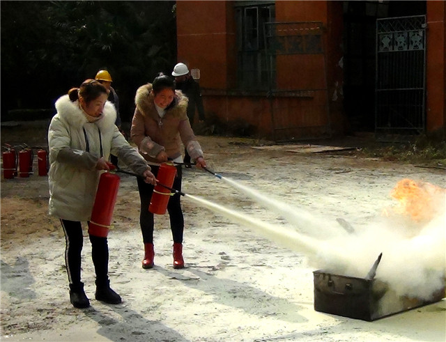 三、常用滅火器材;ABC干粉滅火器,二氧化碳滅火器。使用方法;先拔掉保險銷、右手握住壓把、左手將軟管對準火焰根部,左右掃射2—3米距離,人逆風而站。安技員王典貴還親自演示了用干粉滅火器和水帶撲滅火災的使用方法。