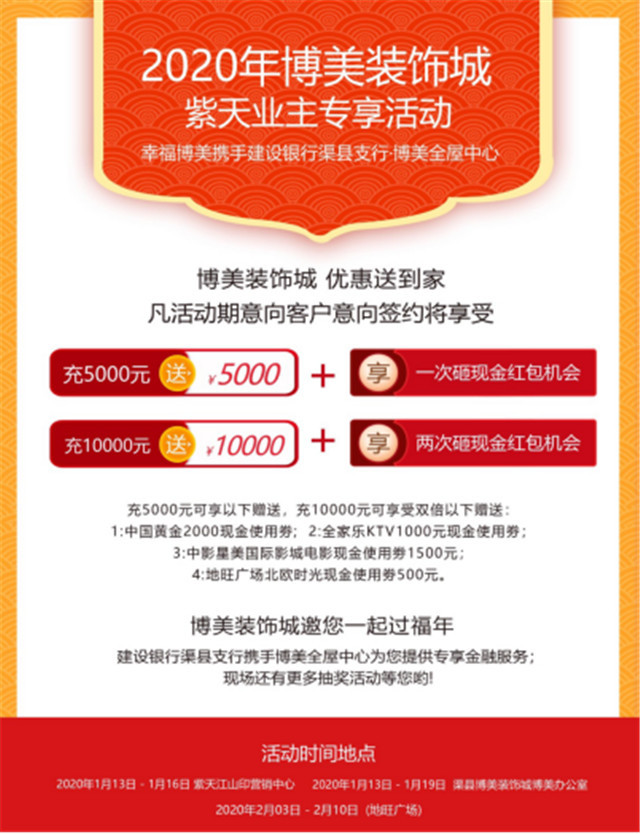 為回饋廣大消費(fèi)者對(duì)博美的信賴,渠縣“博美﹒全屋中心”攜手建設(shè)銀行渠縣支行于前不久開展了主題為“新春紫天業(yè)主專享活動(dòng)”,活動(dòng)內(nèi)容包含:一、到店即送中國(guó)黃金價(jià)值1980元駝絨被一套(憑紫天購(gòu)房合同到指定時(shí)間地點(diǎn)均可享受)。二、意向客戶意向簽約將享受充5000元送5000元并享一次砸現(xiàn)金紅包機(jī)會(huì)、充10000元送10000 元并享砸兩次現(xiàn)金紅包機(jī)會(huì)。三、充5000元可享以下贈(zèng)送,充10000元可享受雙倍以下贈(zèng)送:1.中國(guó)黃金2000元現(xiàn)金使用券;2.全家樂KTV1000元現(xiàn)金使用劵;3.中影星美國(guó)際影城電影現(xiàn)金使用券1500元;4.地旺廣場(chǎng)北歐時(shí)光現(xiàn)金使用券500元。